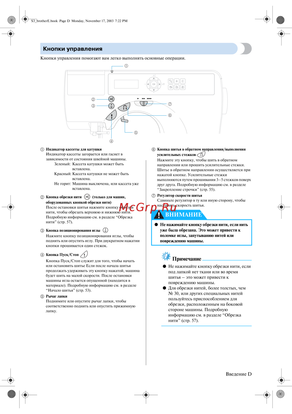 - Не нажимайте кнопку обрезки нити если под лапкой нет ткани или во время шитья это может привести к повреждению машины для обрезки нитей более толстых чем 30 или других специальных нитей пользуйтесь приспособлением для обрезки расположенным на боковой стороне машины подробную информацию см в разделе обрезка нити стр 57 p.5