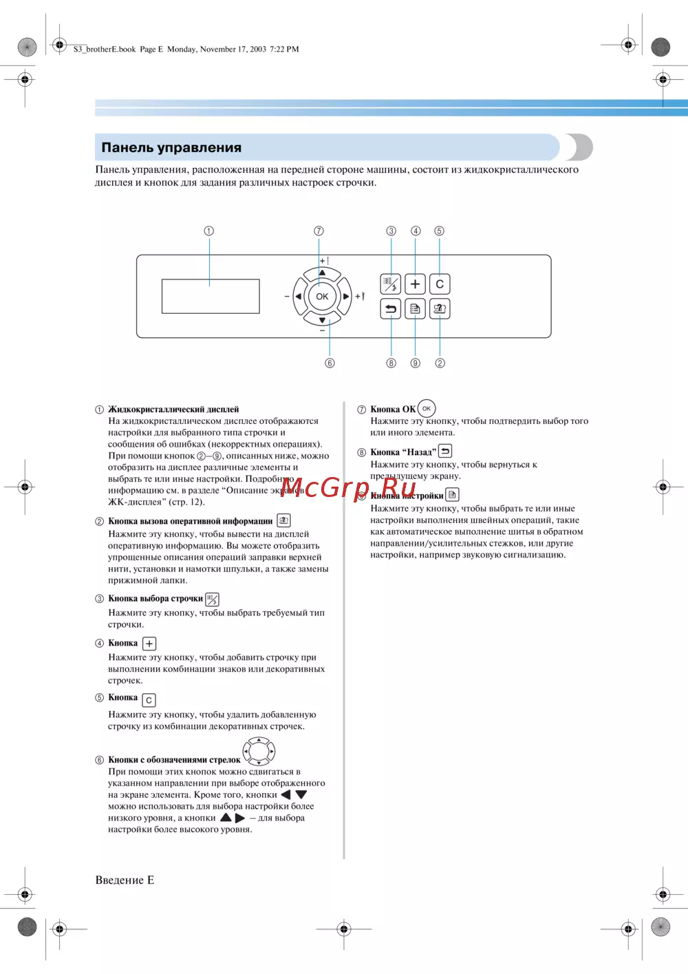 - Панель управления расположенная на передней стороне машины состоит из жидкокристаллического дисплея и кнопок для задания различных настроек строчки p.6