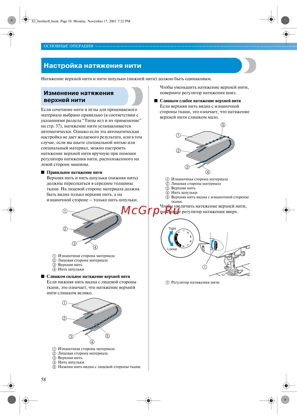 Натяжение верхней нити и нити шпульки (нижней нити) должно быть одинаковым.