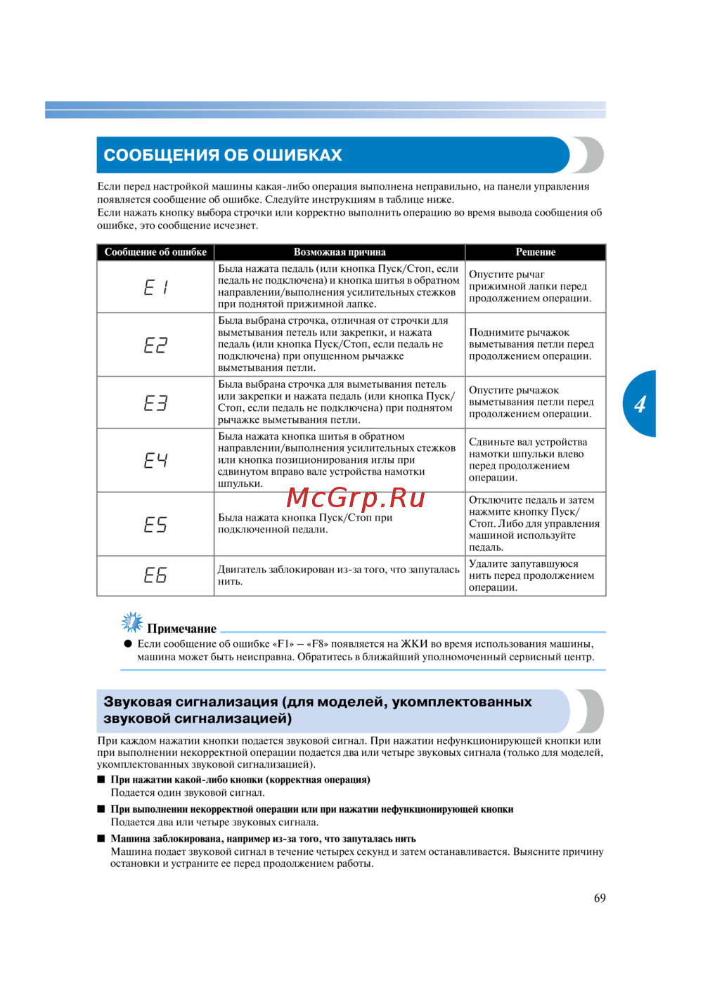 при выполнении некорректной операции подается два или четыре звуковых сигнала (только для моделей,