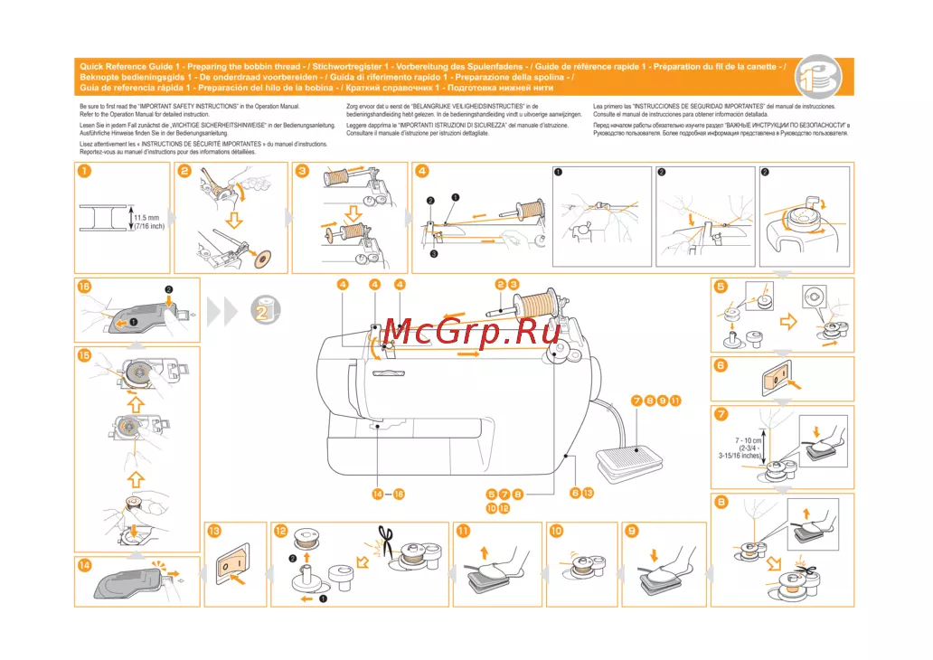 - Quick reference guide 1 preparing the bobbin thread stichwortregister 1 vorbereitung des spulenfadens guide de référence rapide 1 préparation du fil de la canette beknopte bedieningsgids 1 de onderdraad voorbereiden guida di riferimento rapido 1 preparazione della spolina guía de referencia rápida 1 preparación del hilo de la bobina краткий справочник 1 подготовка нижней нити p.1