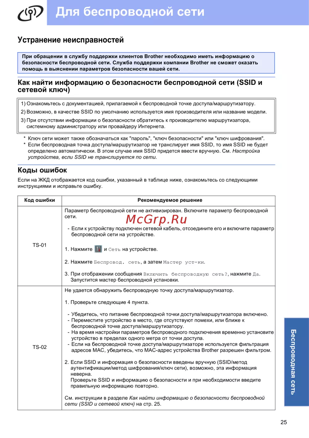 безопасности беспроводной сети. Служба поддержки компании Brother не сможет оказать