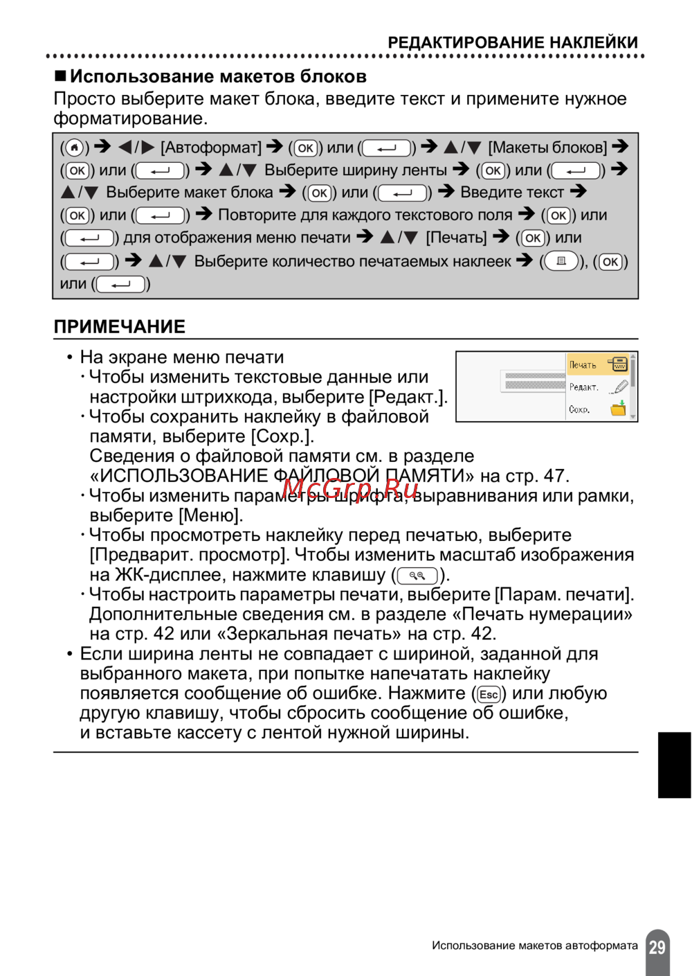 - На экране меню печати чтобы изменить текстовые данные или настройки штрихкода выберите редакт чтобы сохранить наклейку в файловой памяти выберите сохр сведения о файловой памяти см в разделе использование файловой памяти на стр 47 чтобы изменить параметры шрифта выравнивания или рамки выберите меню чтобы просмотреть наклейку перед печатью выберите предварит просмотр чтобы изменить масштаб изображения на жк дисплее нажмите клавишу чтобы настроить параметры печати выберите парам печати дополнительные сведения см в разделе печать нумерации на стр 42 или зеркальная печать на стр 42 если ширина ленты не совпадает с шириной заданной для выбранного макета при попытке напечатать наклейку появляется сообщение об ошибке нажмите или любую другую клавишу чтобы сбросить сообщение об ошибке и вставьте кассету с лентой нужной ширины p.31