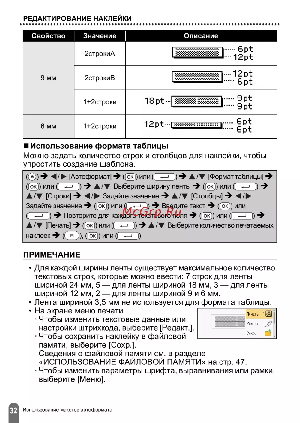 - Для каждой ширины ленты существует максимальное количество текстовых строк которые можно ввести 7 строк для ленты шириной 24 мм 5 для ленты шириной 18 мм 3 для ленты шириной 12 мм 2 для ленты шириной 9 и 6 мм лента шириной 3 5 мм не используется для формата таблицы на экране меню печати чтобы изменить текстовые данные или настройки штрихкода выберите редакт чтобы сохранить наклейку в файловой памяти выберите сохр сведения о файловой памяти см в разделе использование файловой памяти на стр 47 чтобы изменить параметры шрифта выравнивания или рамки выберите меню p.34