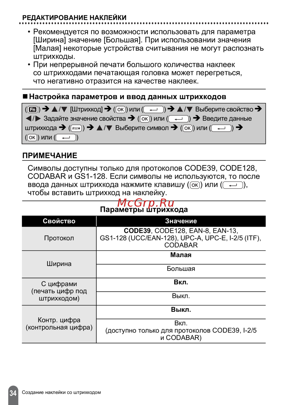 - Рекомендуется по возможности использовать для параметра ширина значение большая при использовании значения малая некоторые устройства считывания не могут распознать штрихкоды при непрерывной печати большого количества наклеек со штрихкодами печатающая головка может перегреться что негативно отразится на качестве наклеек p.36