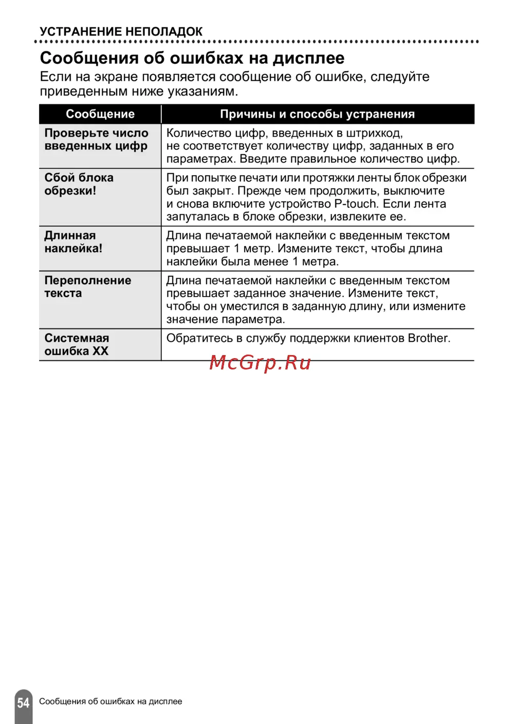 Brother PT-D600VP — устранение неполадок: сообщения об ошибках на дисплее [56/59]
