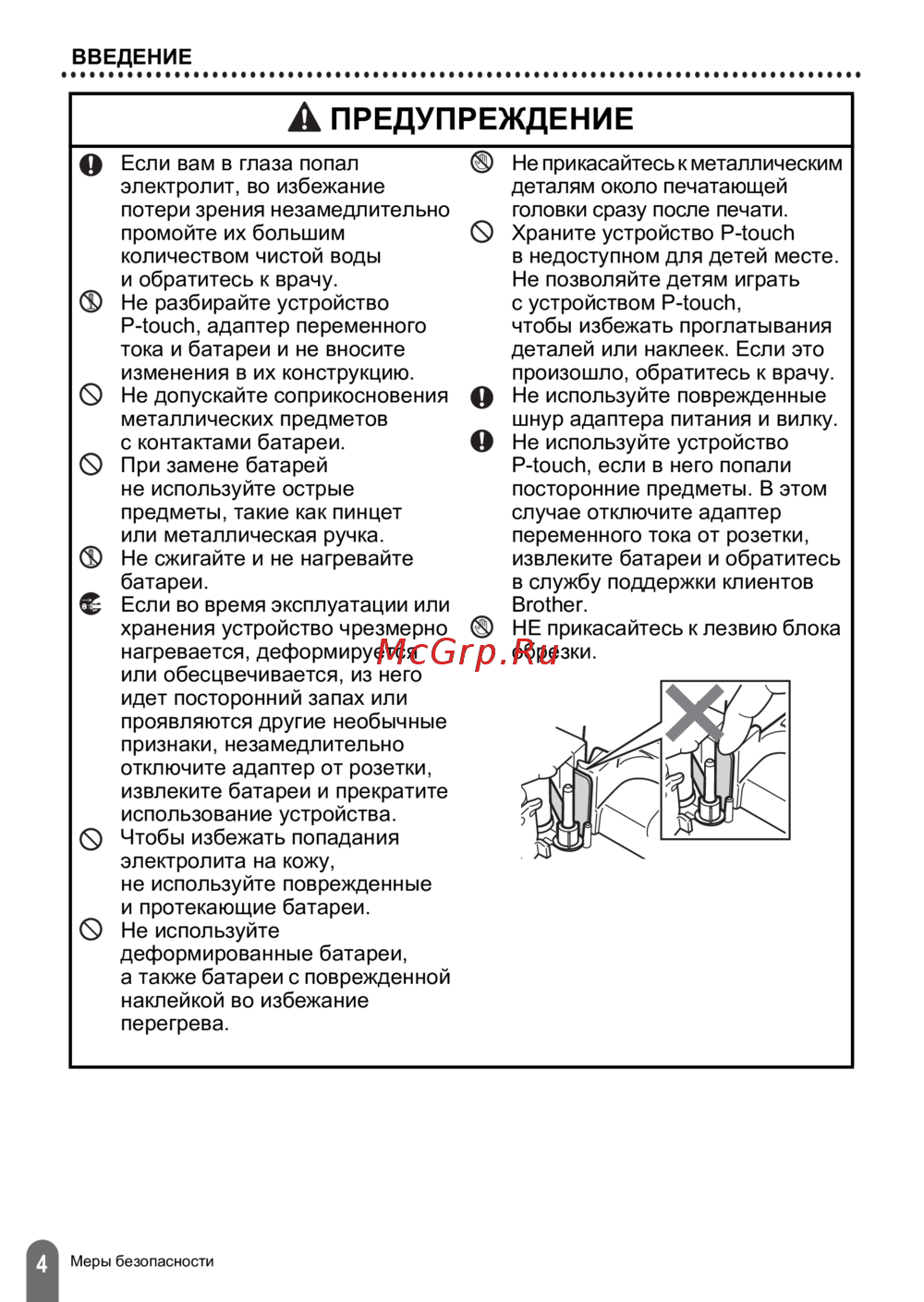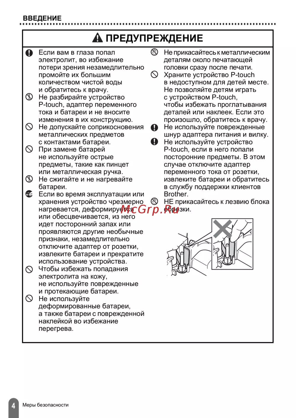 Brother PT-D600VP — меры безопасности при использовании устройства и батарей [6/59]