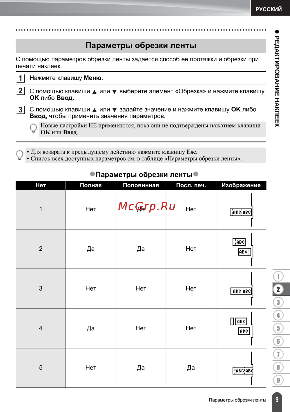 Brother PT-E550WVP [10/67] Параметры обрезки лент