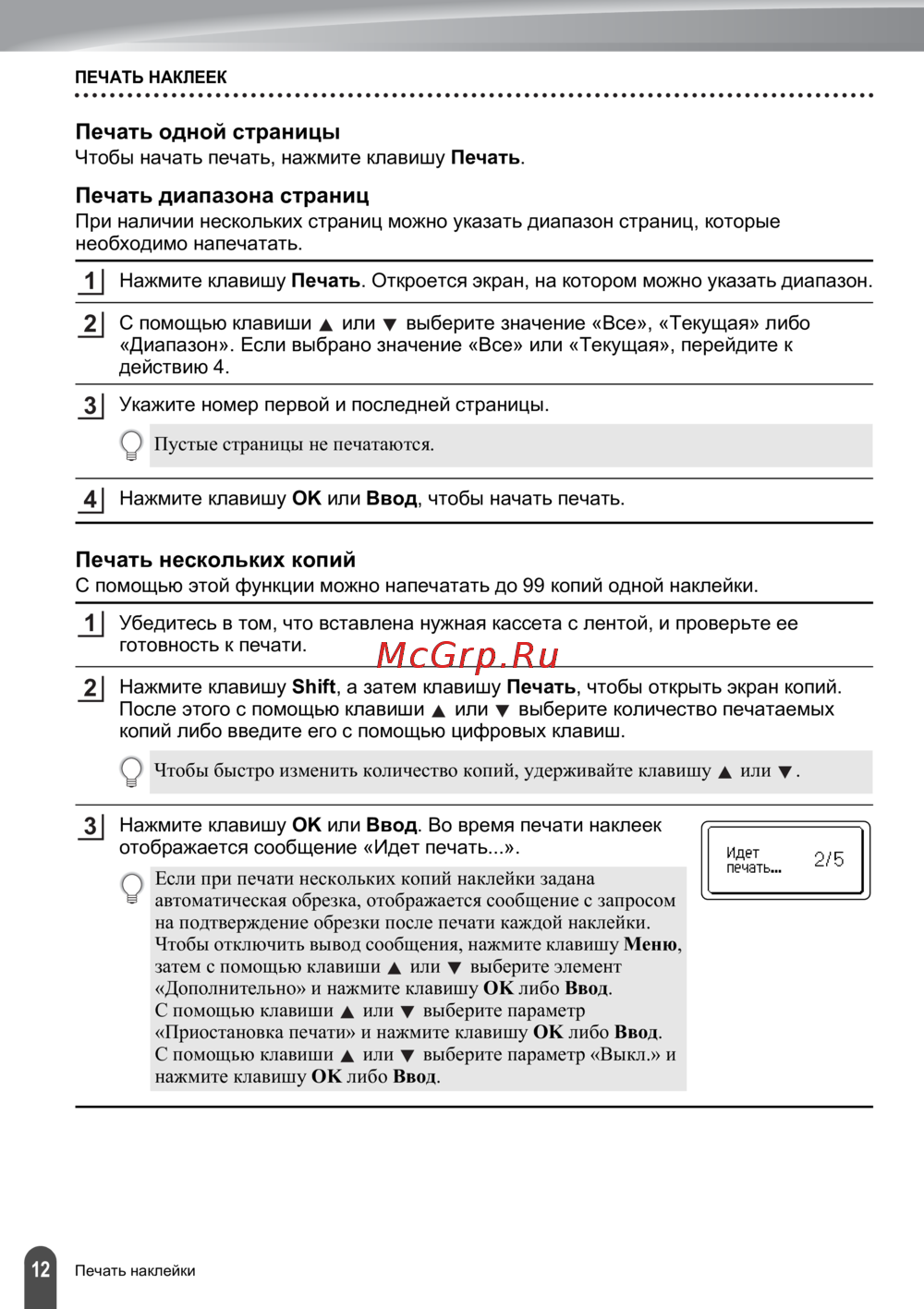 Нажмите клавишу OK или Ввод. Во время печати наклеек