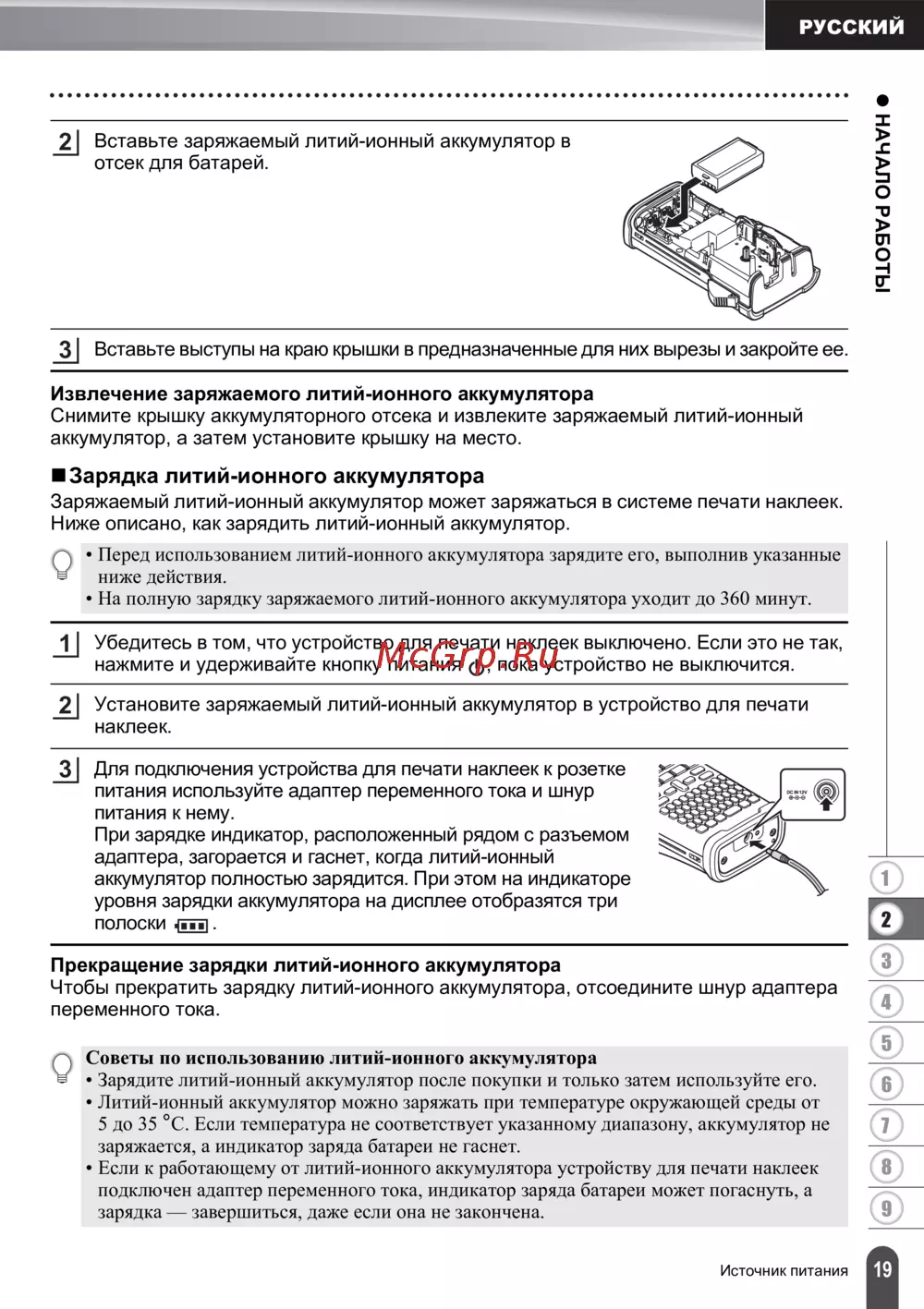 • Перед использованием литий-ионного аккумулятора зарядите его, выполнив указанные