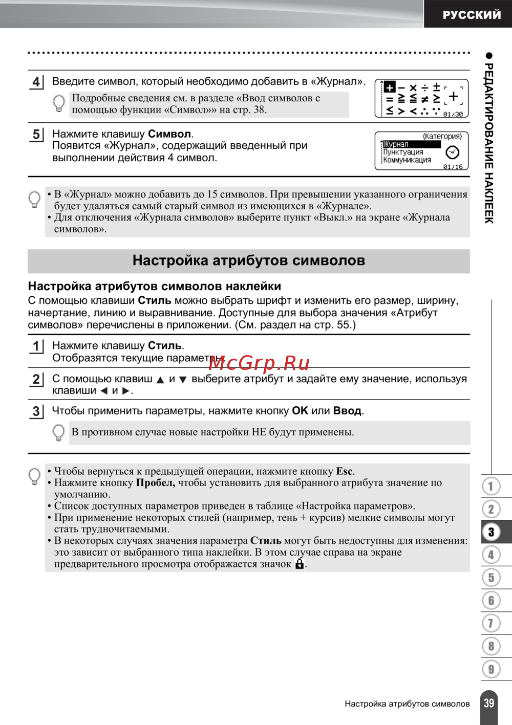 - Использование журнала символов p.40