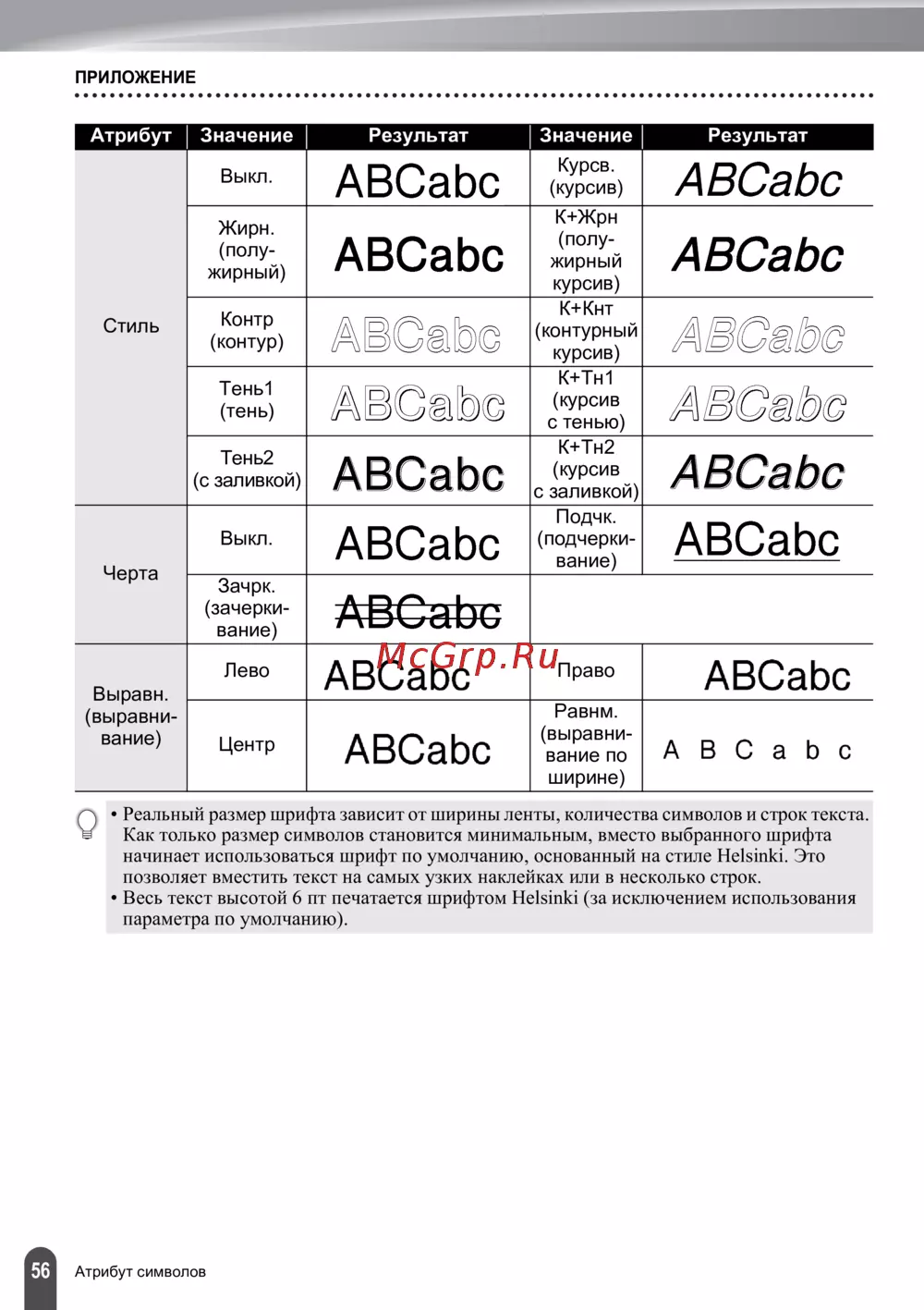 • Реальный размер шрифта зависит от ширины ленты, количества символов и строк текста.