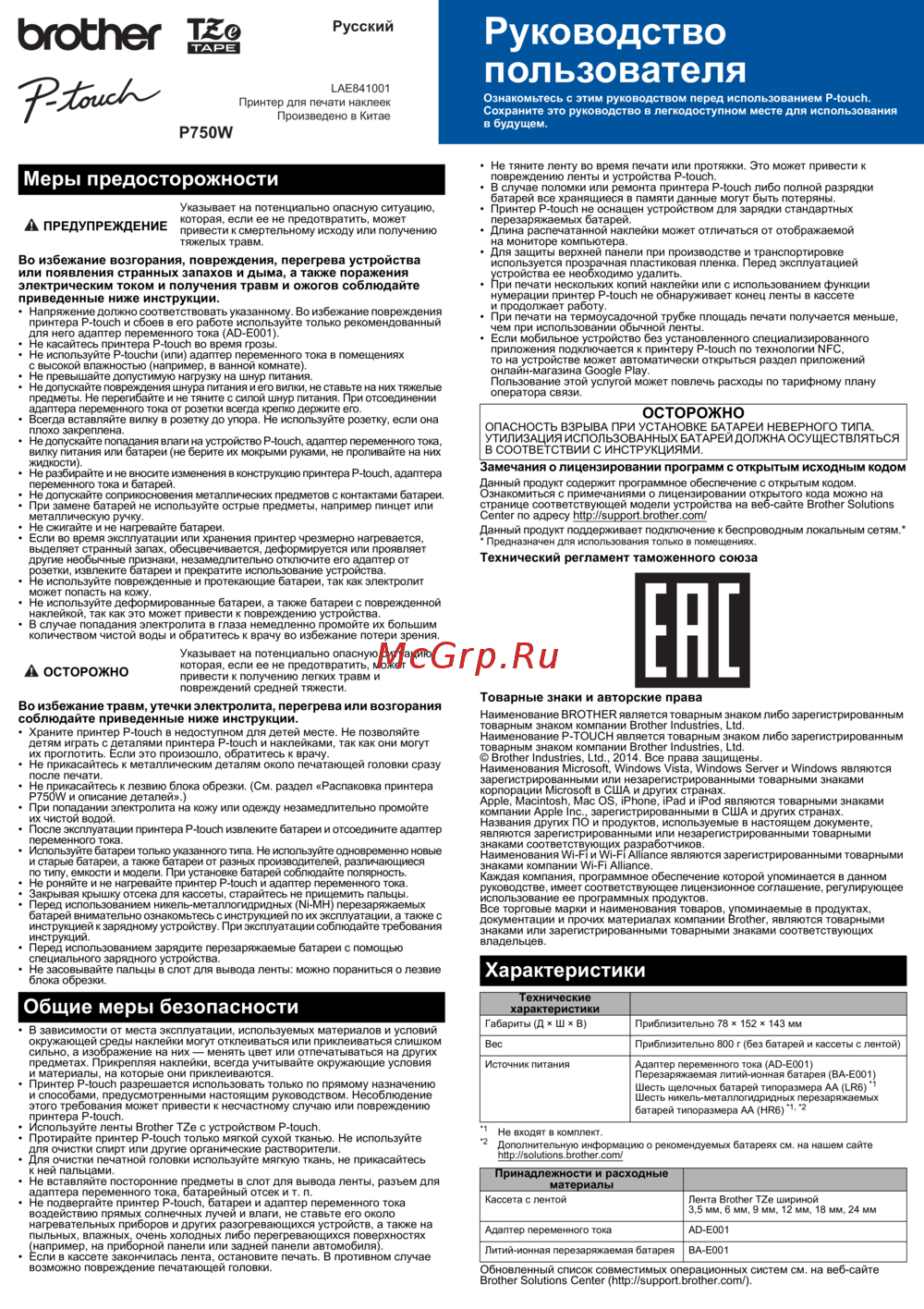 Brother PT-P750W — руководство пользователя для принтера наклеек: безопасность и использование [1/4]