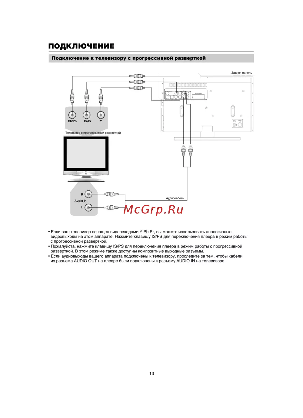 - Если ваш телевизор оснащен видеовходами y pb pr вы можете использовать аналогичные видеовыходы на этом аппарате нажмите клавишу is ps для переключения плеера в режим работы с прогрессивной разверткой пожалуйста нажмите клавишу is ps для переключения плеера в режим работы с прогрессивной разверткой в этом режиме также доступны композитные выходные разъемы если аудиовыходы вашего аппарата подключены к телевизору проследите за тем чтобы кабели из разъема audio out на плеере были подключены к разъему audio in на телевизоре p.15