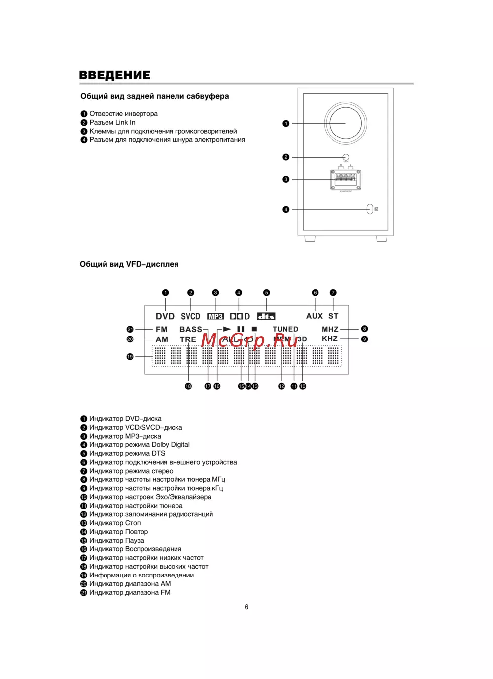 - Подключите кабели громкоговорителей к соответствующим клеммам на задней панели сабвуфера подключите один конец кабеля link in out к соответствующему разъему на задней панели dvd плеера другой конец к соответствующему разъему на задней панели сабвуфера p.11