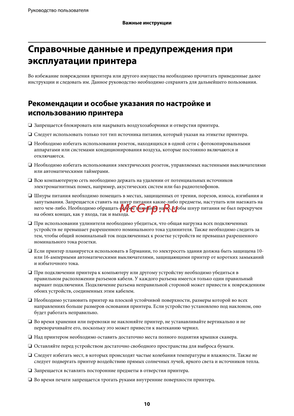 - Рекомендации и особые указания по настройке и использованию принтера p.10