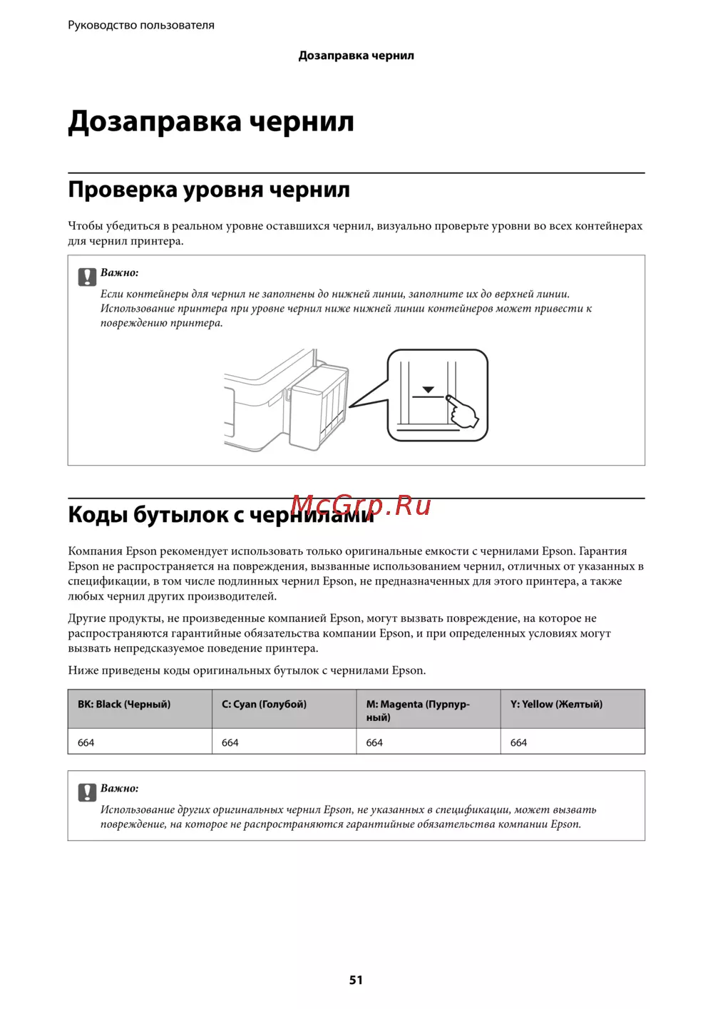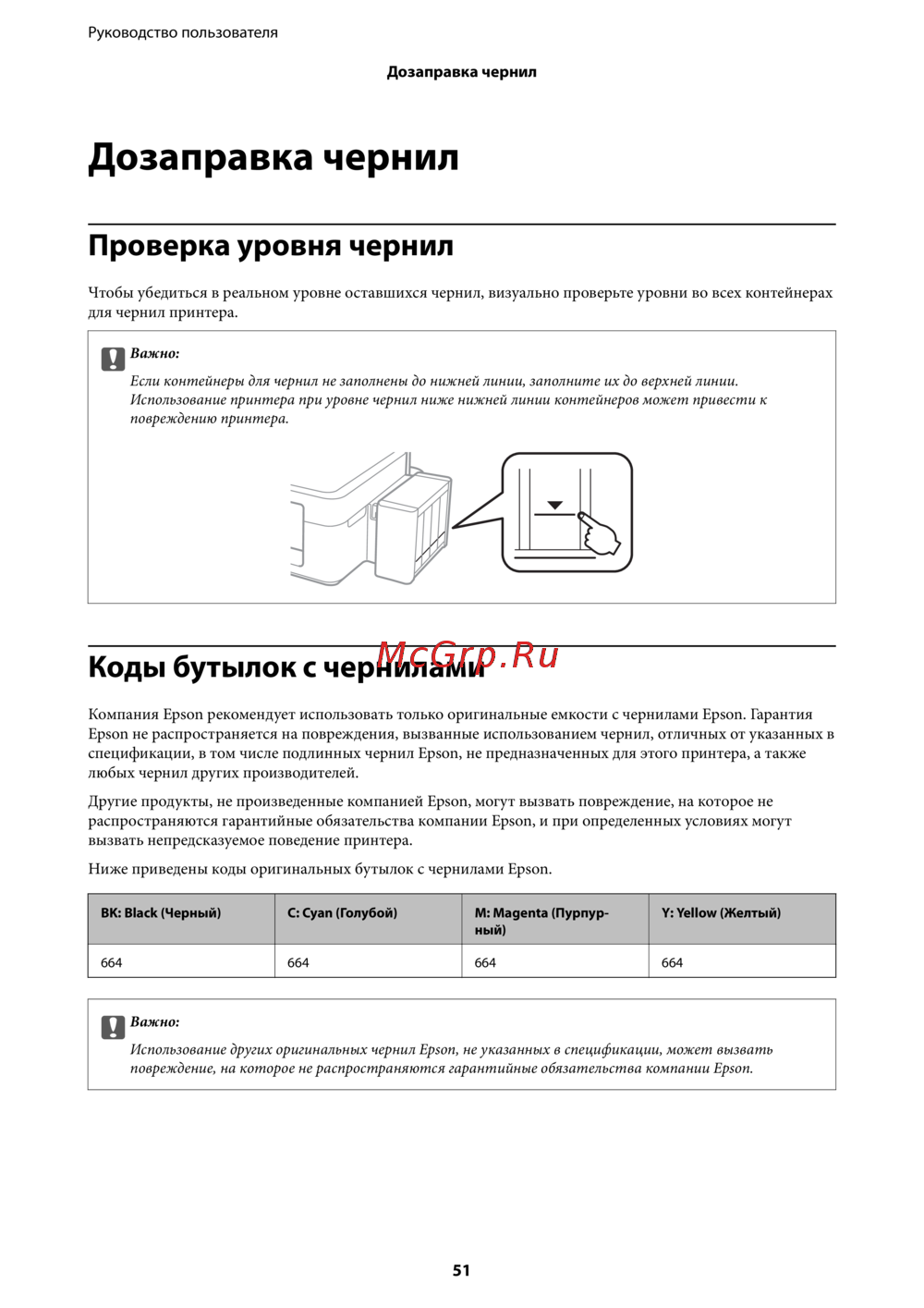 Компания Epson рекомендует использовать только оригинальные емкости с чернилами Epson. Гарантия