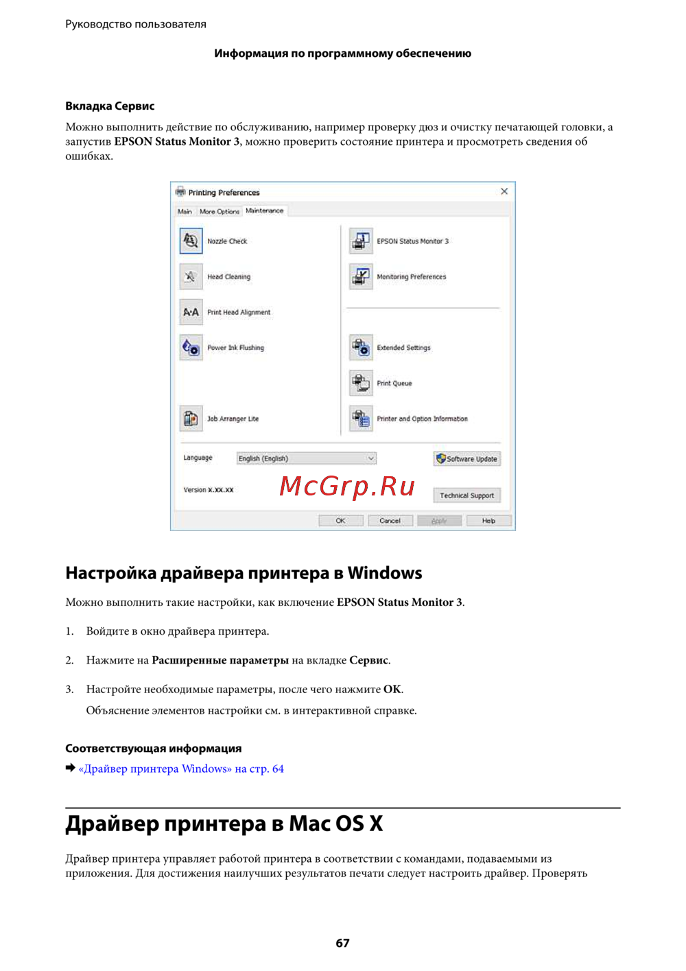 Узнайте, как настроить драйвер принтера в Windows и Mac OS X, а также выполнить обслуживание, включая проверку дюз и очистку печатающей головки.