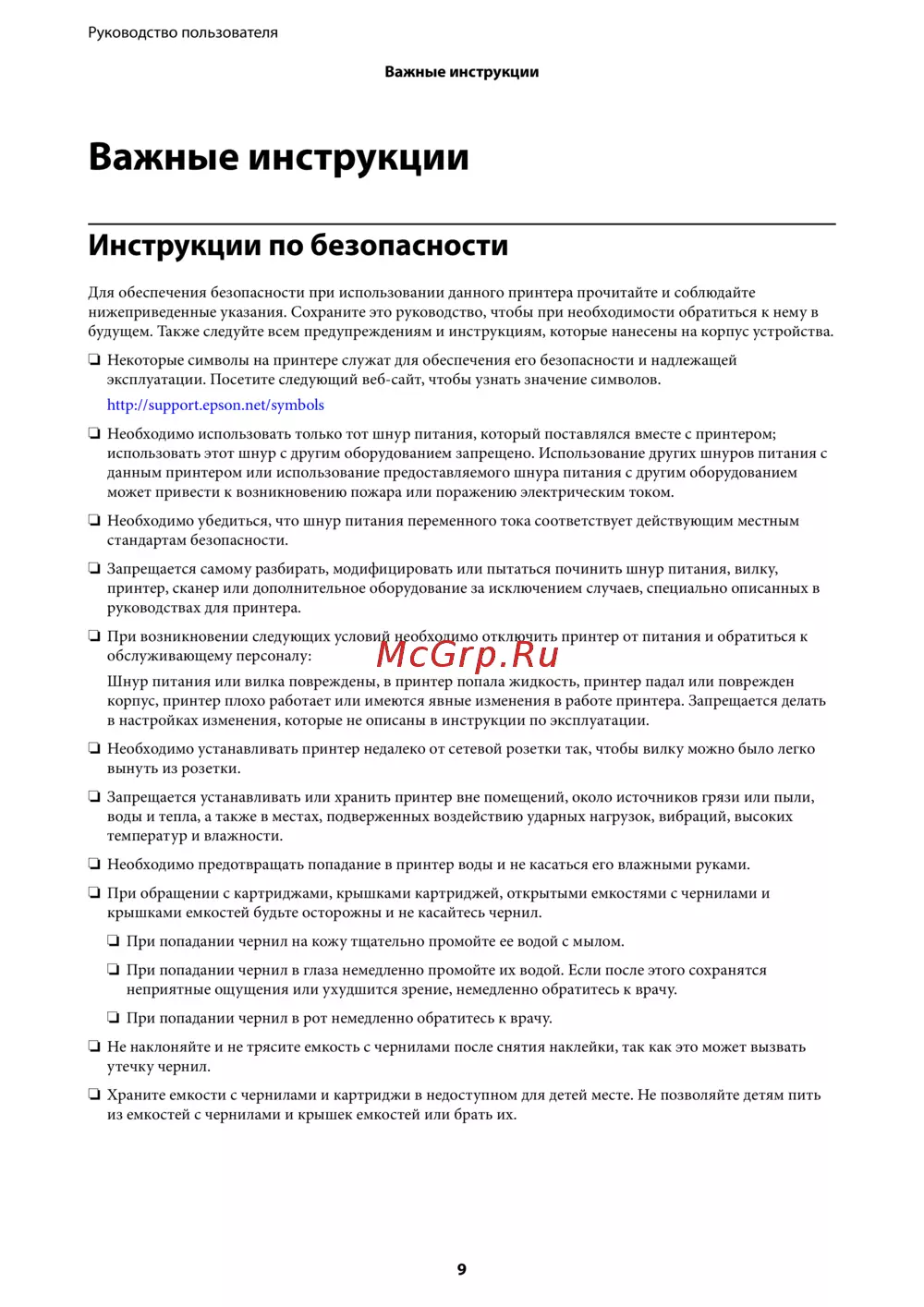 ❏ Некоторые символы на принтере служат для обеспечения его безопасности и надлежащей