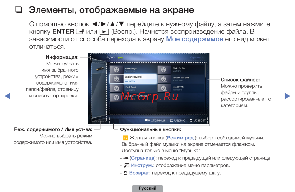- С помощью кнопок перейдите к нужному файлу а затем нажмите кнопку enter e или воспр начнется воспроизведение файла в зависимости от способа перехода к экрану мое содержимое его вид может отличаться p.128