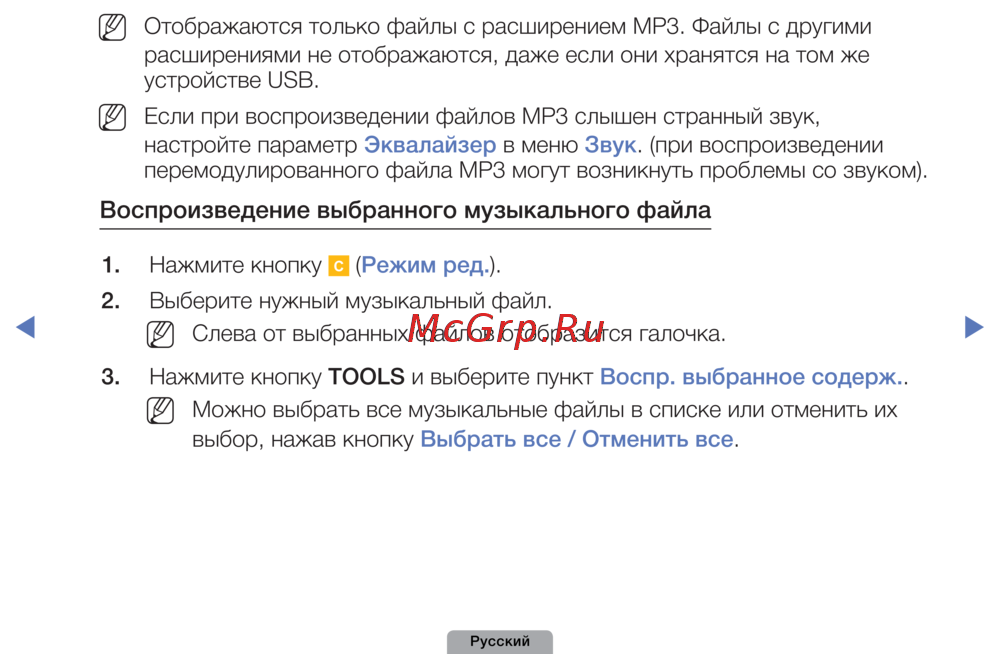 - С помощью кнопок перейдите к нужному файлу а затем нажмите кнопку enter e или воспр начнется воспроизведение файла в зависимости от способа перехода к экрану мое содержимое его вид может отличаться p.128