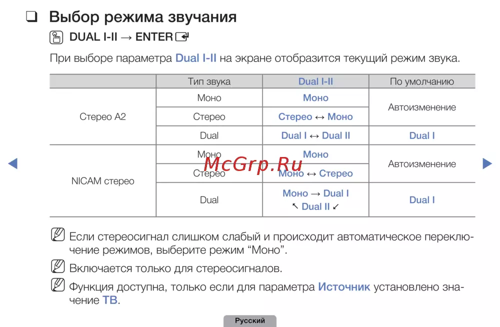 При выборе параметра Dual I-II на экране отобразится текущий режим звука.