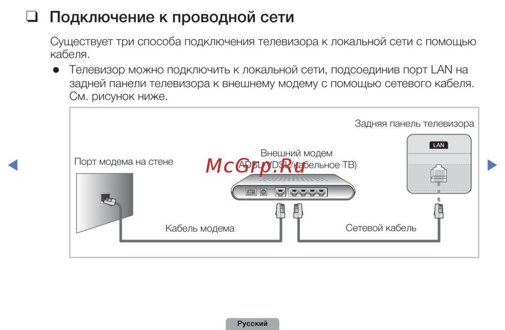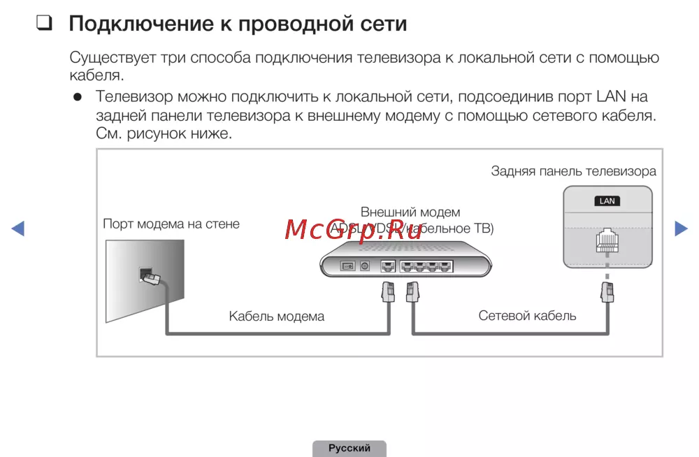 - Существует три способа подключения телевизора к локальной сети с помощью кабеля p.59