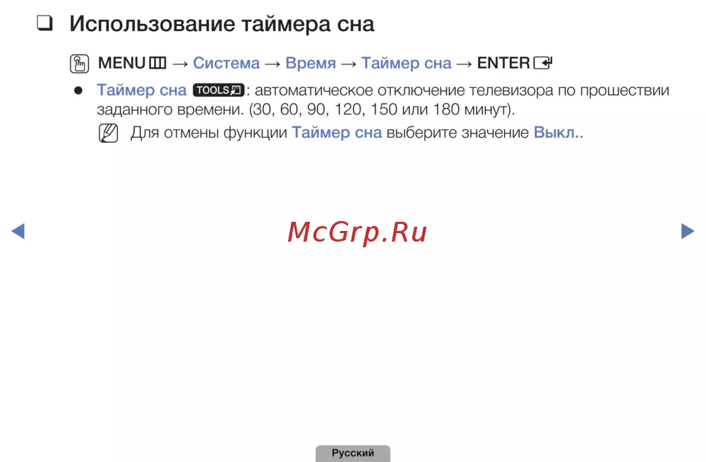 Для отмены функции Таймер❑сна выберите значение Выкл..