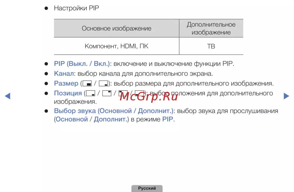 PIP❑(Выкл.❑/❑Вкл.): включение и выключение функции PIP.