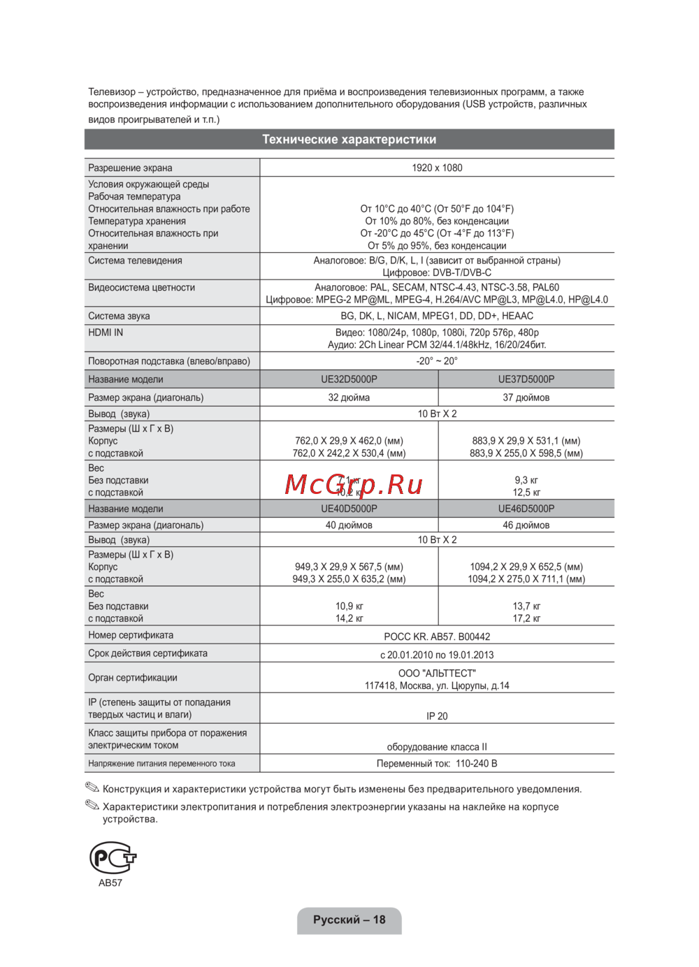Название модели UE40D5000P UE46D5000P