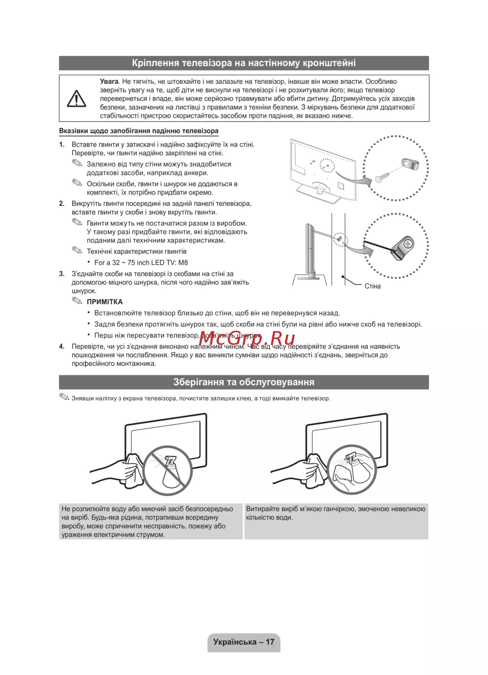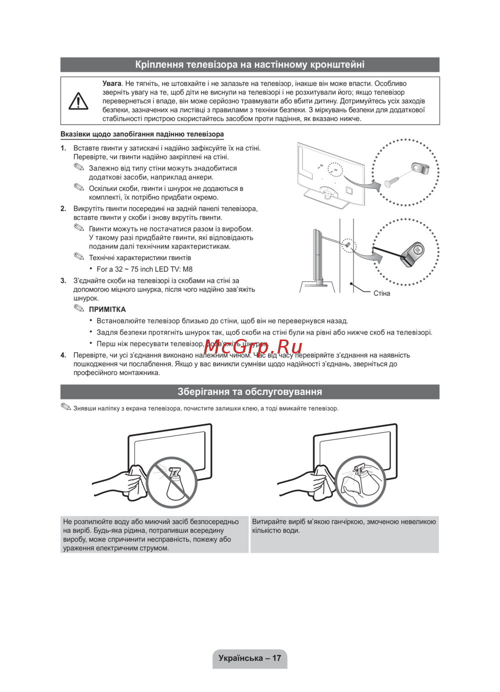 Увага. Не тягніть, не штовхайте і не залазьте на телевізор, інакше він може впасти. Особливо