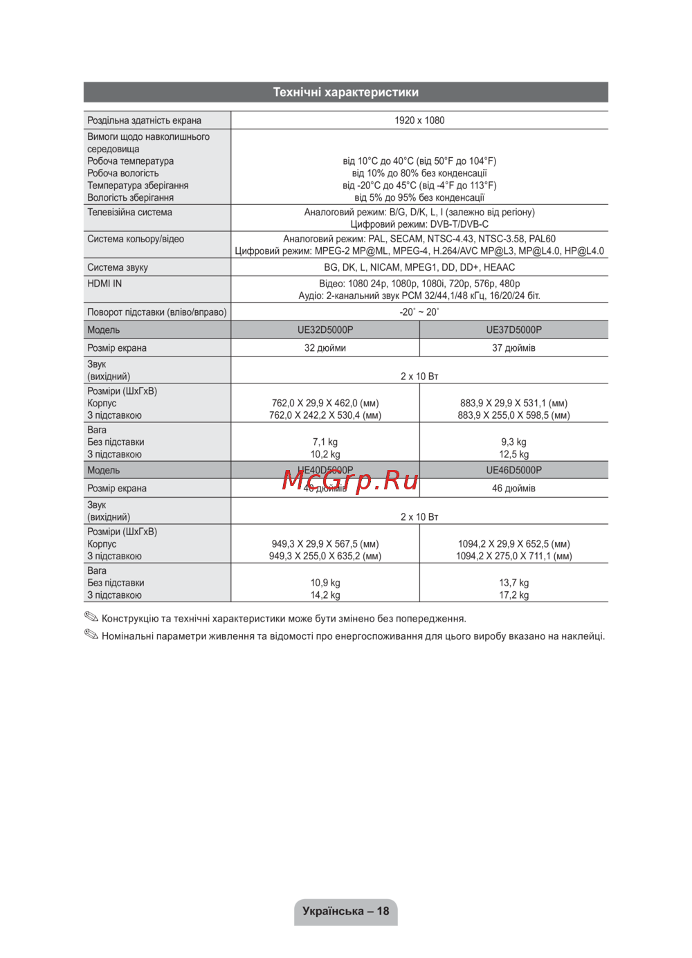 - Конструкцію та технічні характеристики може бути змінено без попередження p.54