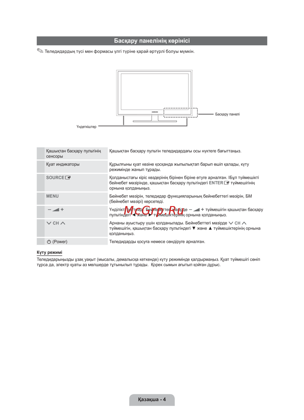 Теледидардың басқару панелінің негізгі функциялары мен түймешіктері туралы ақпарат. Қашықтан басқару пультінің қолданылуы мен қуат режимдері түсіндірілген.