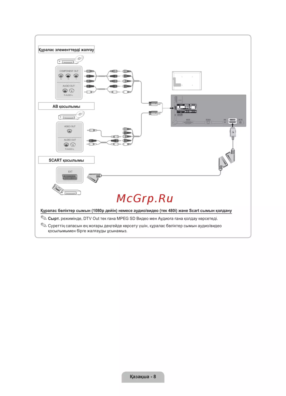 Құралас элементтерді жалғау бойынша нұсқаулық. АВ және SCART қосылымдарын пайдалану арқылы сурет пен дыбыс сапасын арттыру жолдары.