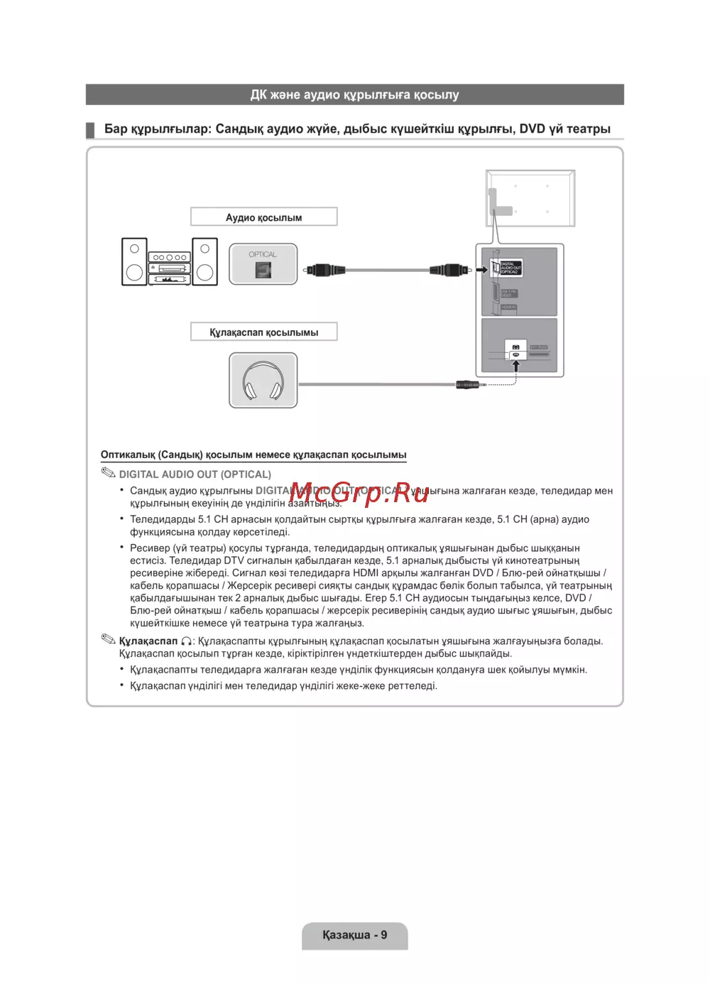 Сандық аудио құрылғыны DIGITAL AUDIO OUT (OPTICAL) ұяшығына жалғаған кезде, теледидар мен