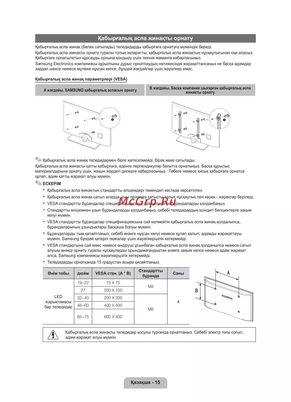 VESA стандартты бұрандалар спецификациясына сай келмейтін бұрандаларды қолданбаңыз.
