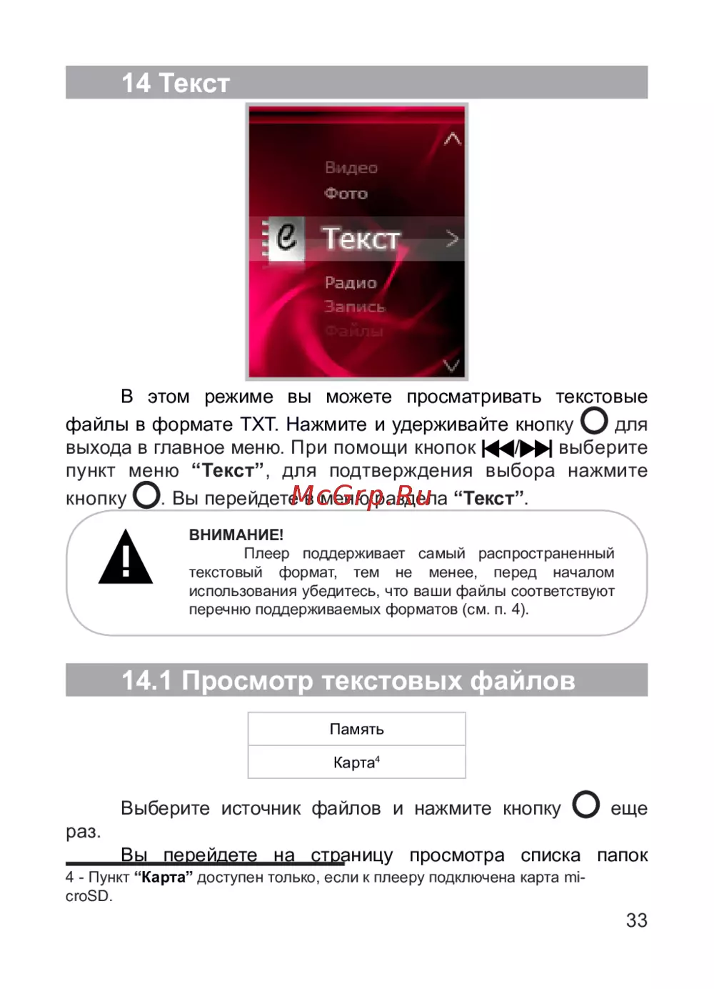 4 - Пункт “Карта” доступен только, если к плееру подключена карта mi-