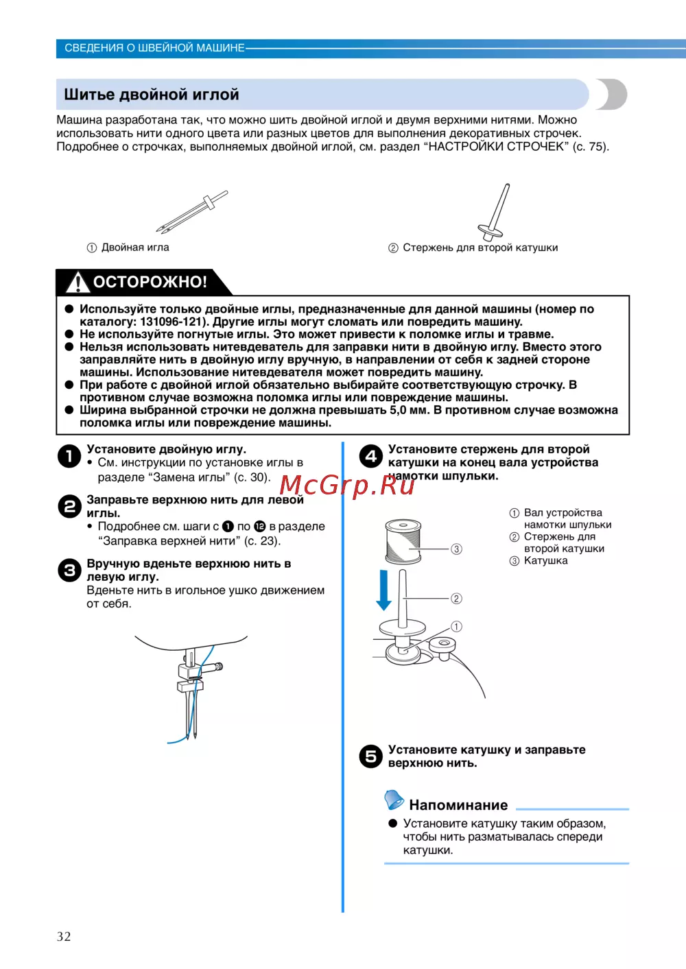 ● Нельзя использовать нитевдеватель для заправки нити в двойную иглу. Вместо этого