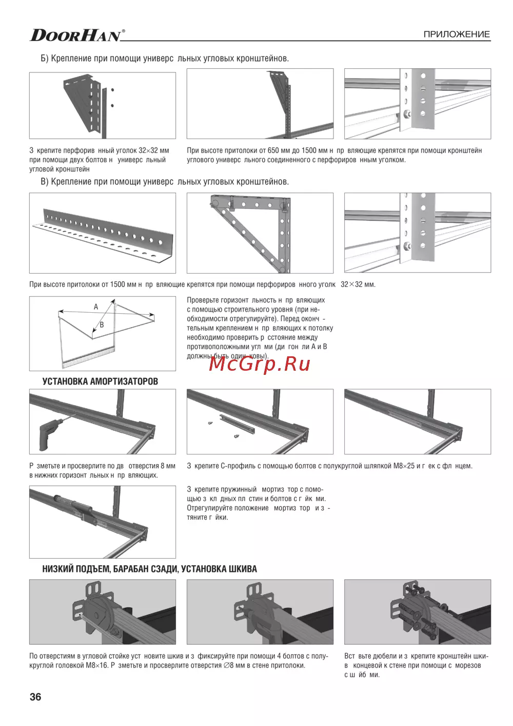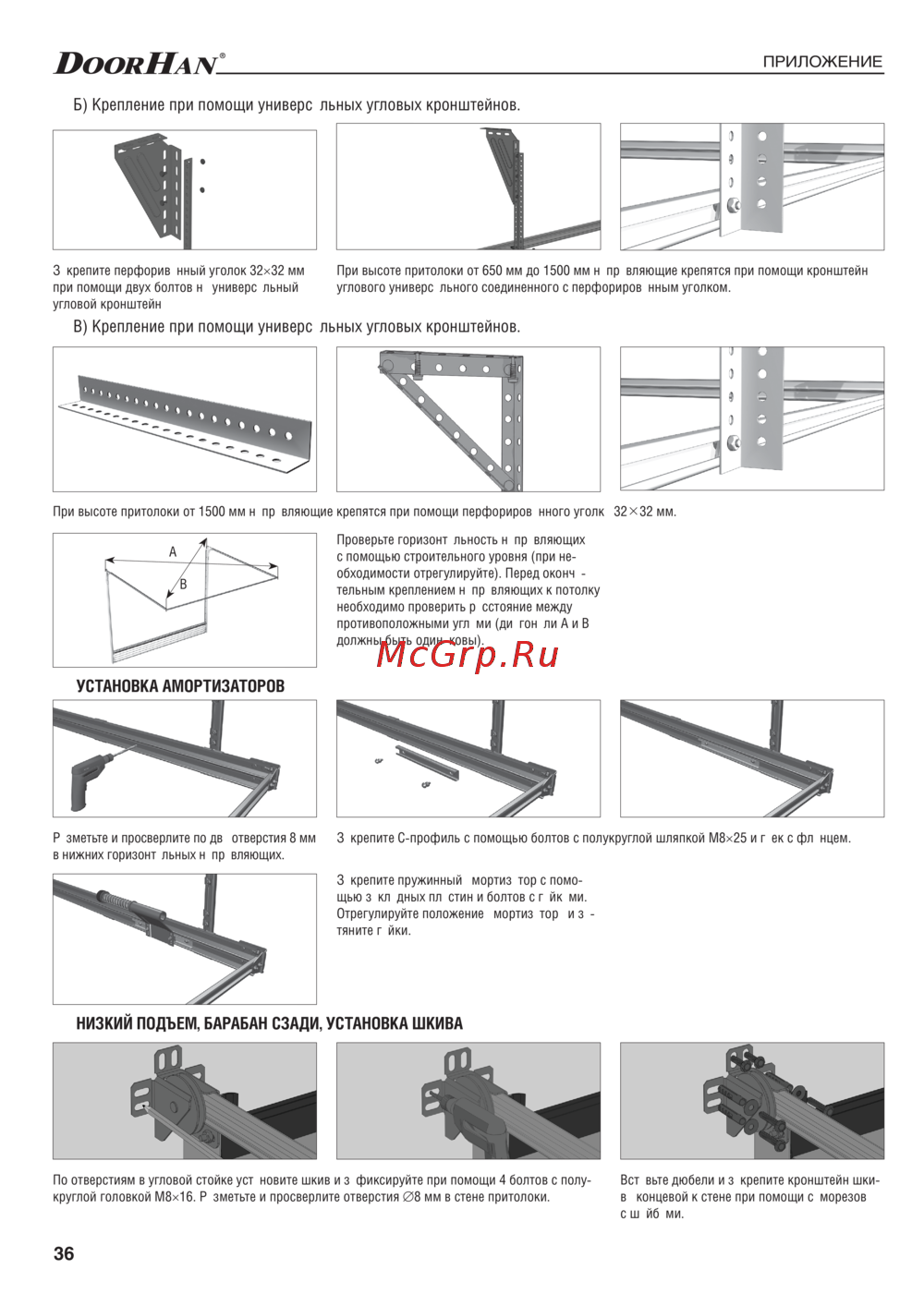 - Установка концевых опорных кронштейнов при низком подъеме p.35
