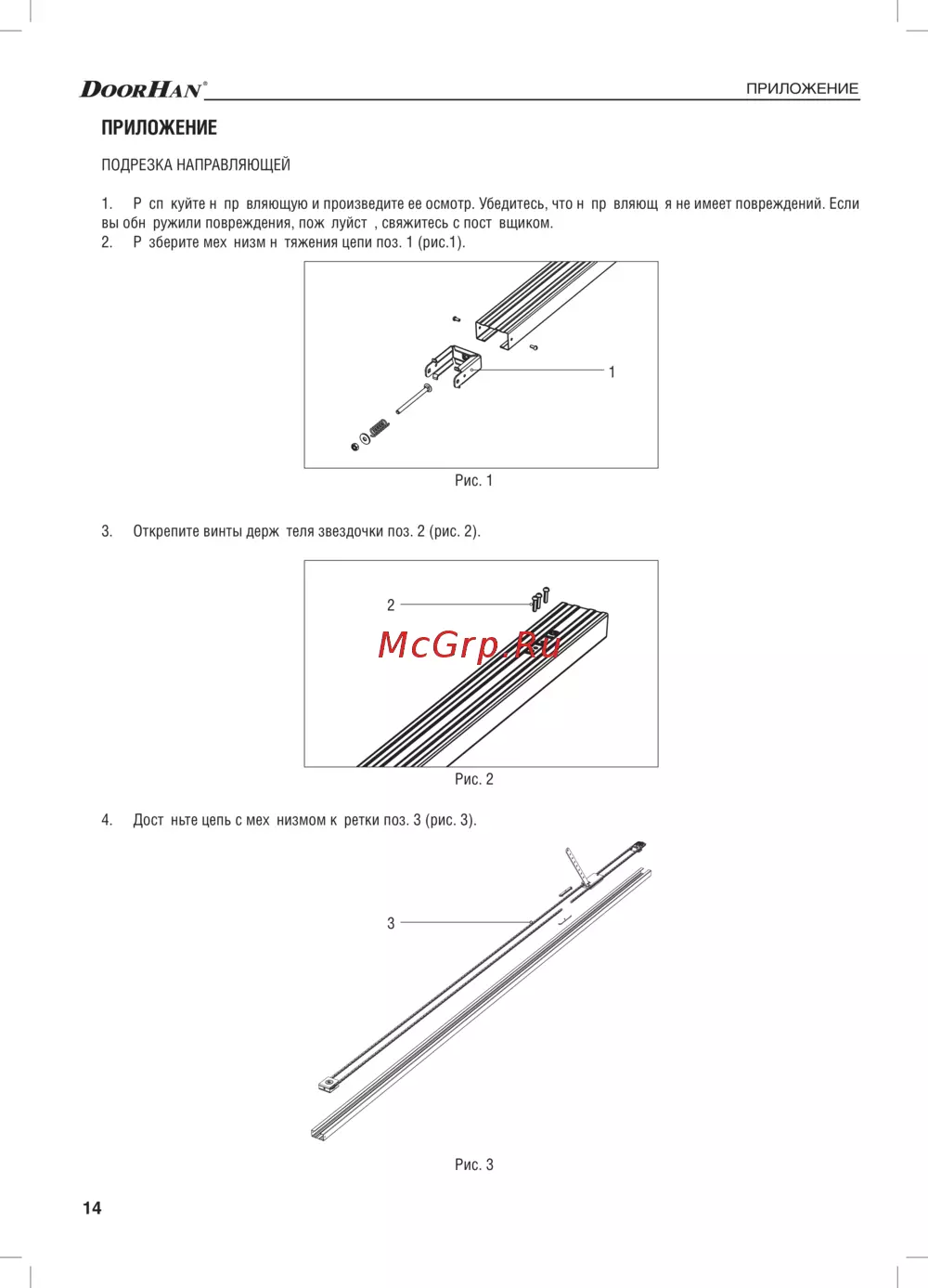 - Высотаподвесаприводаобуславливаетсямаксимальнымподъемомверхнейкромкиполотнаворот послевыполне нияпредварительнойсборки см п можноприступатькустановкенаправляющей 1 еслинеобходимоукоротитьнаправляющую товыполнитедействия описанныевприложении1 2 напритолокеотметьтевертикальнуюлинию соответствующуюцентруворотпогоризонтали рис 3 расположитекронштейнкреплениякпритолоке 1 такимобразом чтобырасстояниеотверхнейкромкиоткрыто гополотнаворотдонижнегокраянаправляющейсоставлялонеменее10мм рис изакрепитеегокпритолоке припомощисаморезов 2 рис 4 соединитенаправляющую 3 икронштейнкреплениякпритолокеприпомощиболтафиксациинаправляющей 4 рис5 5 установитеu образныйкронштейн 5 нанаправляющуюориентировочнонарасстоянии2 3lиприкрепитекпо толку рис 6 установитекронштейныкреплениянаправляющей 6 нанаправляющуюориентировочнона1 3lиприкрепите кпотолку рис 7 установитекронштейнкреплениятягикполотну 7 всерединеверхнегоалюминиевогопрофиляполотнаворот изакрепитеспомощьюсаморезов 8 рис 8 закрепитеизогнутуютягу 9 накрон p.7