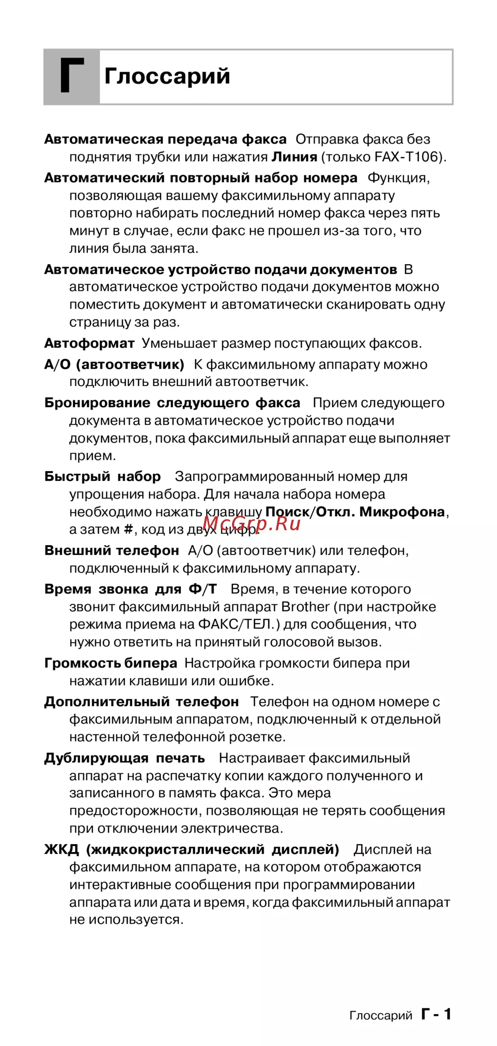 Brother FAX-T104 — глоссарий терминов факсимильной связи и их объяснения [105/118]
