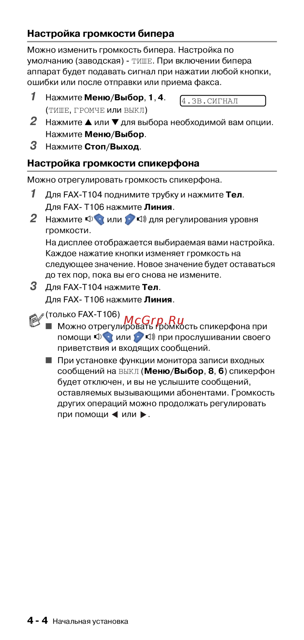 Brother FAX-T104 — настройка громкости бипера и спикерфона для устройств [36/118]
