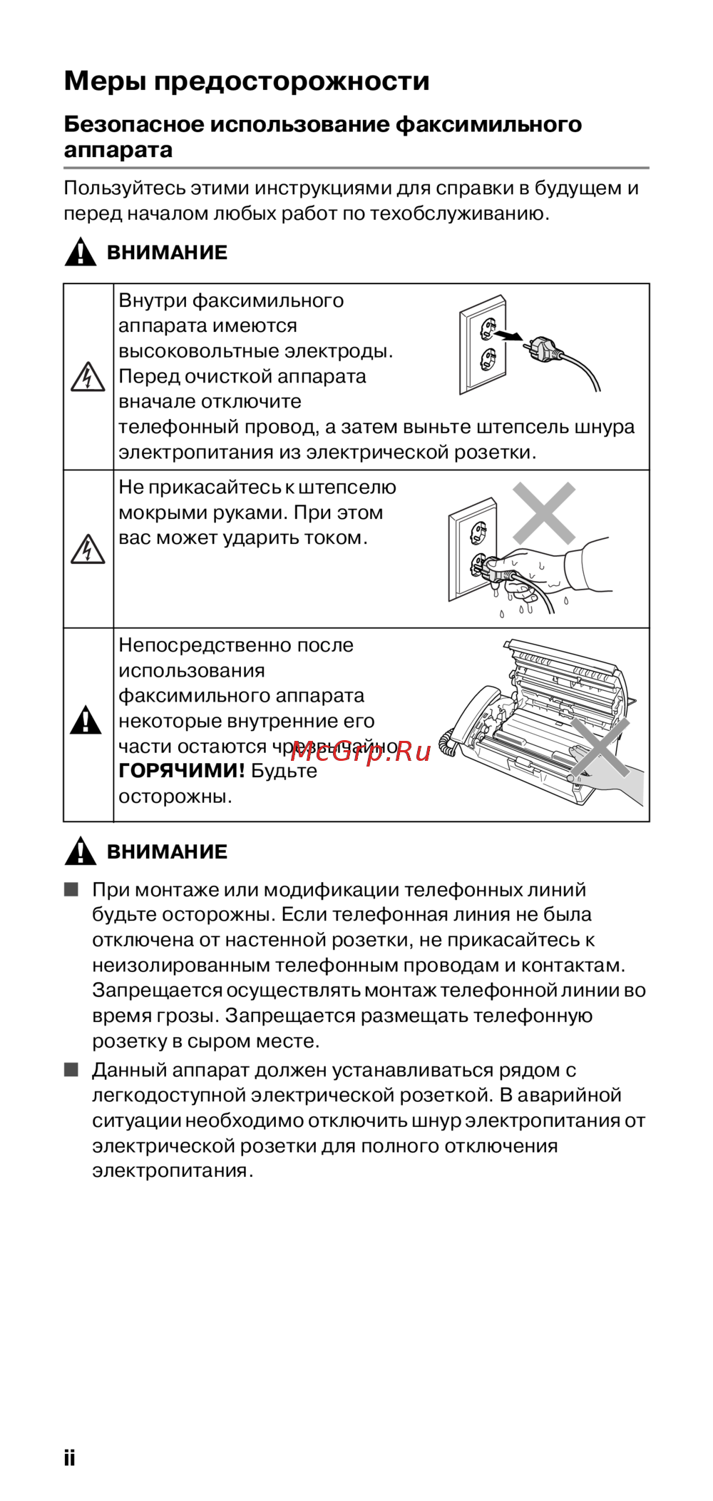 - Безопасное использование факсимильного аппарата p.4