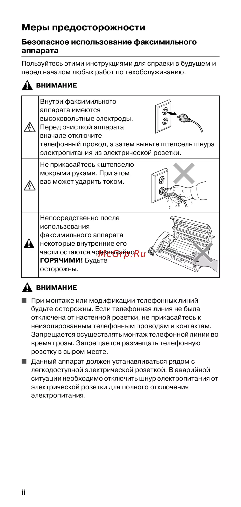 Следуйте инструкциям по безопасному использованию факсимильного аппарата. Узнайте, как избежать электрических ударов и других опасностей при работе с устройством.