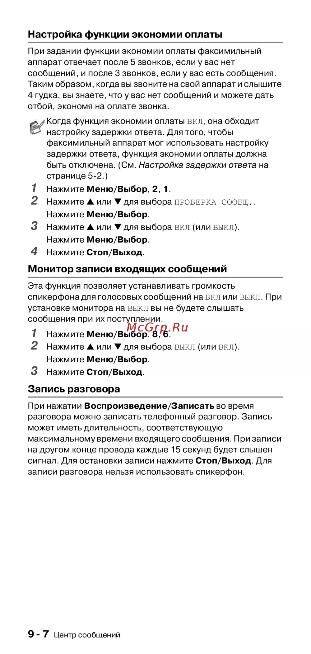 Инструкция по настройке экономии оплаты, монитора сообщений и записи разговоров на факсимильном аппарате. Узнайте, как использовать задержку ответа.