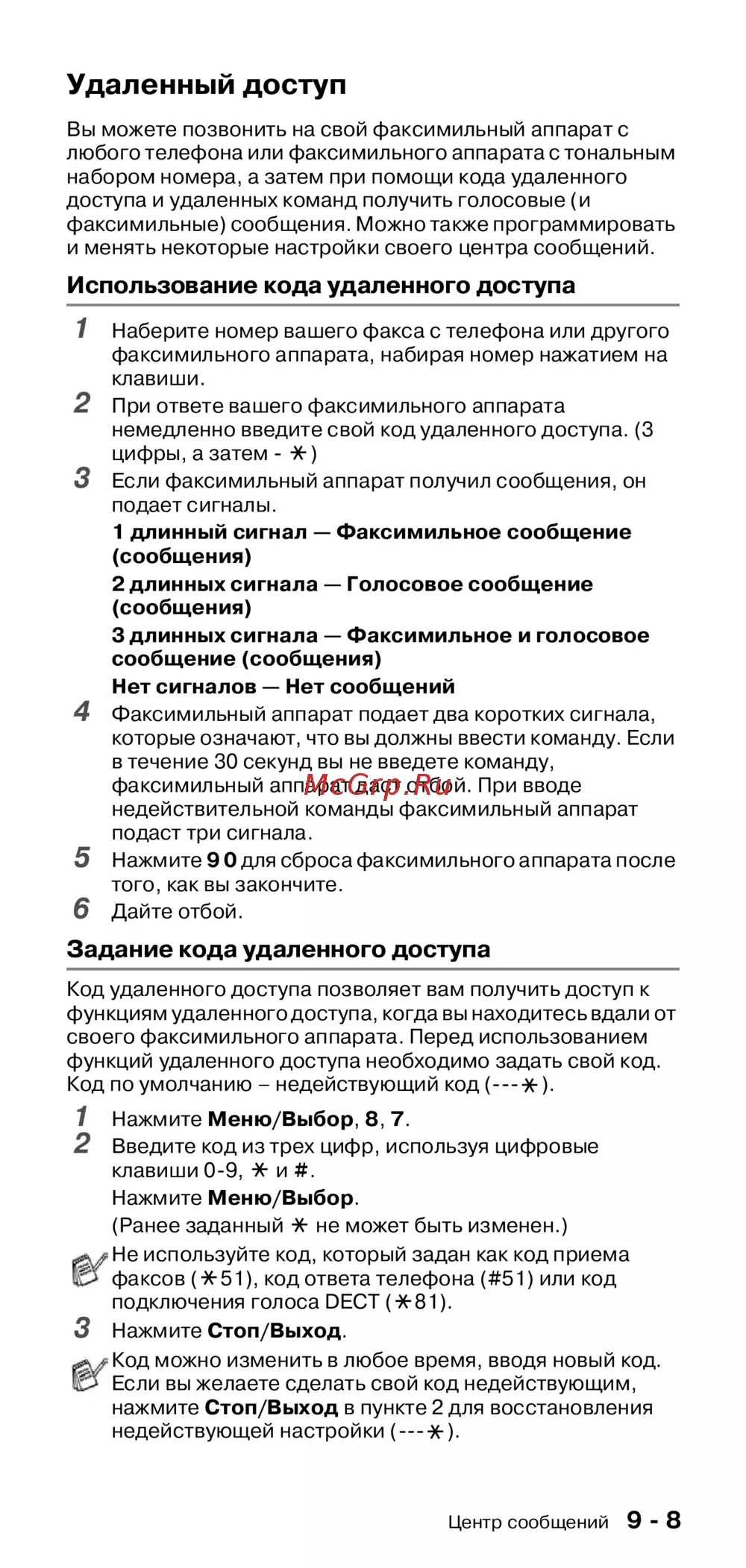 - Если вы находитесь вдали от своего аппарата для получения доступа к нему выполняйте приведенные ниже команды когда вы вызываете свой факсимильный аппарат и вводите свой код удаленного доступа 3 цифры а затем система подает два коротких сигнала и вам необходимо ввести команду удаленного управления p.82