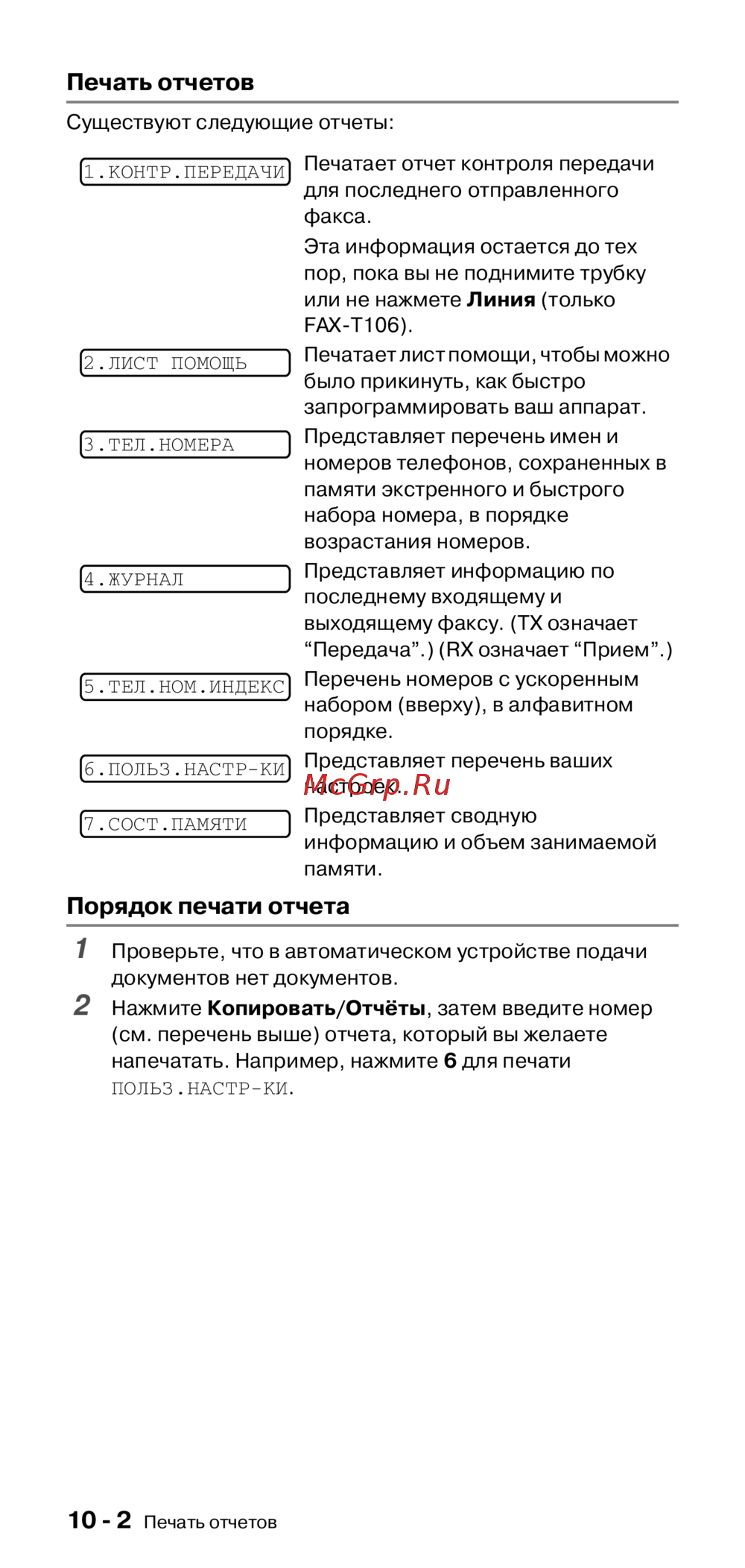Brother FAX-T104 — инструкция по печати отчетов и настройкам устройства [86/118]