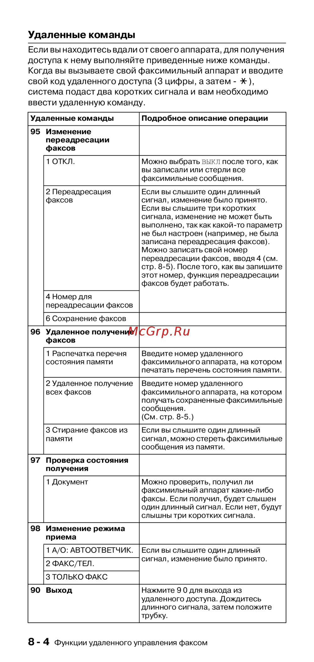 - Если вы находитесь вдали от своего аппарата для получения доступа к нему выполняйте приведенные ниже команды когда вы вызываете свой факсимильный аппарат и вводите свой код удаленного доступа 3 цифры а затем система подает два коротких сигнала и вам необходимо ввести команду удаленного управления p.82