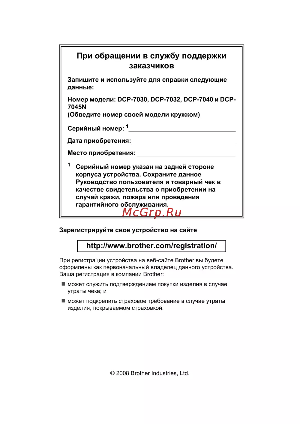 Brother DCP-7030R — информация для обращения в службу поддержки заказчиков [2/107]
