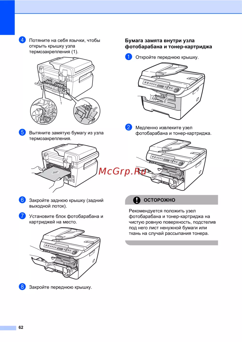 Узнайте, как правильно извлечь замятую бумагу из узла термозакрепления и фотобарабана. Следуйте простым шагам для безопасного устранения проблемы.
